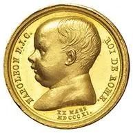 Au gr. 3,6 mm 14 D/ Teste accollate, a d., di Napoleone (laureata) e Maria Luigia (diademata). Sotto ANDRIEU F R/ NAPOLEON F J C ROI DE ROME Busto a s. di Napoleone II infante. Sotto l’incollatura GALLE / XX MARS / MDCCCXI