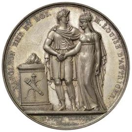per il matrimonio con Maria Luigia opus Andrieu e Jouannin (1810) Ag mm 39 D/ Teste accollate, a d., di Napoleone (laureata) e Maria Luigia (diademata). Sul taglio del collo di Napoleone, ANDRIEU F e, sotto, DENON D R/ NAPOLEON EMP ET ROI M LOUISE D'AUTRICHE I due sovrani si stringono la mano accanto ad un'ara accesa, sulla cui base J JOUANNIN