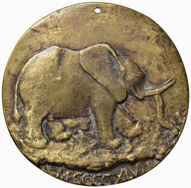 in bronzo opus Matteo de’ Pasti. Ae fuso mm 80,2 D/ D ISOTTAE ARIMINENSI Busto a destra R/ Elefante volto a destra su un prato fiorito. Esergo MCCCCXLVI. Hill 187 Pollard I, 49 Vannel-Toderi Bargello 85/86. Fusione postuma. q.SPL foro di sospensione