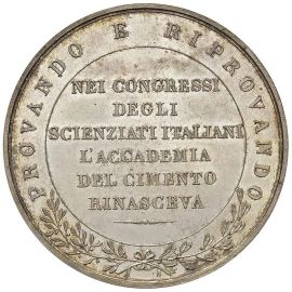 del III congresso degli Scienziati Italiani opus Nideröst (1841) Ag mm 54 D/ Tribuna di Galileo, nel Museo di Fisica e Storia Naturale di Firenze. Sotto FIRENZE 1841 / NIDERÖST F. R/ PROVANDO E RIPROVANDO Nel campo NEI CONGRESSI DEGLI SCIENZIATI ITALIANI L’ACCADEMIA DEL CIMENTO RINASCEVA