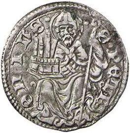 Ag D/ BONONI ADOCET Nel campo leone rampante R/ S PETR ONIVS Nel campo santo seduto che regge la città nella mano destra Chim. 181 SPL