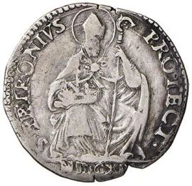 Ag D/ PAV LVS V PONT MAX in basso BOL XX Nel campo stemma a targa. In basso a sinistra stemma Capponi sormontato da galero cardinalizio e a destra quello crociato cittadino R/ S PETRONIVS PROTECT Nel campo santo seduto con pastorale e piviale. Esergo MDCXIIII Chim. 438 Munt. 195a MB/BB