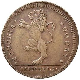 Ae D/ PIVS SEXTVS PONTIFEX MAXIMVS Esergo MDCCXCV R/ BONONIA DOCET Nel campo leone rampante. Esergo BAIOCCHI 2 Chim. 1126 SPL Rara