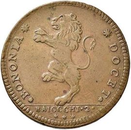 Ae D/ PIVS SEXTVS PONTIFEX MAXIMVS Esergo MDCCXCVI R/ BONONIA DOCET Nel campo leone rampante. Esergo BAIOCCHI 2 BB+