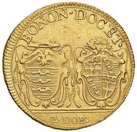 Au D/ PIVS VI PONT MAXIMVS Nel campo pianta di giglio. Esergo 1787 R/ BONONIA DOCET Nel campo stemma cardinalizio Archetti, a sinistra, e quello cittadino crociato a destra. Esergo G P Chim. 982 Munt. 168 Rara q.SPL
