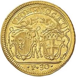 Au D/ PIVS VI PONT MAXIM Nel campo pianta di giglio. Esergo P 30 R/ BONONIA DOCET Nel campo stemma cardinalizio partito Boncompagni-Lodovisi, a sinistra, e quello cittadino crociato a destra. Esergo 1778 Chim. 975 Munt. 163 Rara SPL