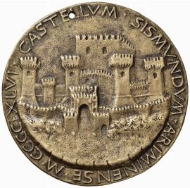 in bronzo opus Matteo de’ Pasti. Ae fuso mm 80 D/ SIGISMVNDVS PANDVLFVS MALATESTA PAN F Busto a sinistra in armatura e cotta di maglia R/ CASTELLVM SISMVNDVM ARIMINENSE M CCCC XLVI La rocca malatestiana di Rimini. Hill 186 Pollard I,45 Vannel-Toderi Bargello 73. Fusione antica. SPL foro di sospensione