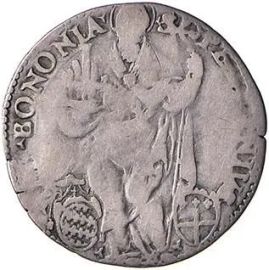 Ag D/ SIXTVS V PONT MAX Nel campo stemma a targa ovale del pontefice sormontato da chiavi decussate e tiara R/ S PETRONIVS DE BONONIA Nel campo santo stante con piviale nella sinistra e città di Bologna nella destra. Ai lati stemmi Salviati a sinistra e quello cittadino crociato a destra Chim. 392 Munt. 99 BB/MB