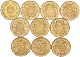 SVIZZERA, DIECI MONETE IN ORO DA 20 FRANCHI