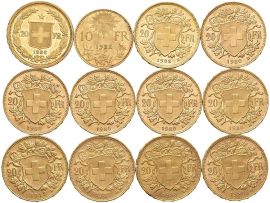 SVIZZERA, DODICI MONETE IN ORO DA 20 FRANCHI