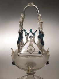 in vetro incolore e blu con tracce di doratura, corpo in foggia di vascello centrato sui lati lunghi da mascheroni intervallati da roselline applicate, con beccuccio a prua ad alludere al bompresso e la lavorazione a giorno a poppa a fare riferimento al sartiame, poggiante su ampio piede circolare che si stringe a formare un nodo costolonato, alt. cm 29