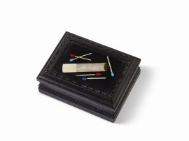 B) in legno ebanizzato con placca in marmo nero e commesso di pietre dure raffigurante “Pipa, sigari e fiammiferi”, cm 4,5x13,2x9