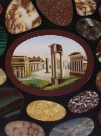 con profilo mistilineo in marmo nero del Belgio, pietre di scavo, malachite, lapislazzulo e micromosaico ovale raffigurante “Il Foro Romano”, cm 11,8x16,8