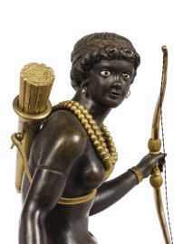 in bronzo patinato e dorato; base ovale decorata a rilievo con scene di putti che giocano e festoni, quadrante circolare in smalto con numeri romani per le ore e piccoli numeri arabi per i minuti, sormontato da figura femminile seduta raffigurante l'Africa affiancata da leonessa e tartaruga. Questo modello è attribuito a Jean-Simon Deverberie, cm 48x40x17