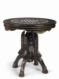 in marmo nero del Belgio e commesso di pietre dure raffigurante al centro scacchiera, diam. cm 76. Montato su tavolo in noce parzialmente ebanizzato con profili in oro, alt. cm 75