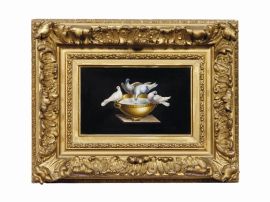 in marmo nero del Belgio e micromosaico raffigurante Le colombe di Plinio, cm 11x17,4. Entro cornice in legno dorato. Sul retro etichetta delle Rev. Fabbrica di S. Pietro in Vaticano con titolo La tazza delle Colombe del Campidoglio e prezzo Lire 100