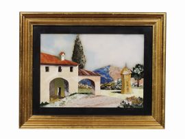 commesso di pietre dure su marmo nero, firma R. Casini in basso a destra, cm 22,5x29,2. Entro cornice in legno dorato