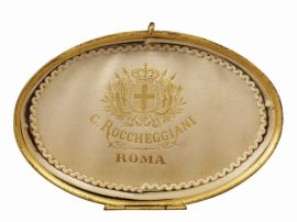 di forma ovale in metallo dorato e smalti, sul coperchio micromosaico su cassina in marmo nero del Belgio raffigurante “Piazza San Pietro”, cm 6x11x7,2. All’interno reca l’iscrizione “C. Roccheggiani / Roma / Via Condotti”