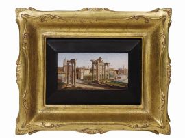 micromosaico su cassina di marmo nero del Belgio, cm 12,2x18. Entro cornice in legno dorato