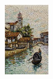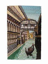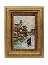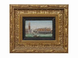micromosaico su cassina in metallo, cm 9x14. Entro cornice in legno dorato