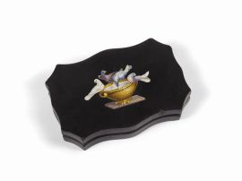 A) con profilo mistilineo in marmo nero del Belgio e micromosaico raffigurante “Le colombe di Plinio”, cm 10,4x7