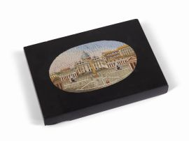 C) di forma rettangolare in marmo nero del Belgio e micromosaico ovale raffigurante “Piazza San Pietro”, cm 10,4x14,5