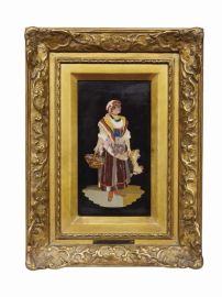 B) di forma rettangolare in marmo nero e commesso di pietre dure raffigurante "Contadina in abiti toscani", cm 22,6x12,6. Entro cornice in legno dorato