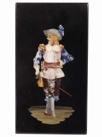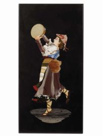 C) di forma rettangolare in marmo nero e commesso di pietre dure raffigurante “Saltarella”, cm 22,4x11,2
