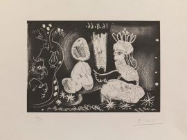 N. 28 DI SOLI 30 ESEMPLARI DI TESTA, i soli accompagnati da una splendida SUITE con le TAVOLE TUTTE FIRMATE A MATITA DA PICASSO, impresse su carta Moulin Richard-de-Bas a grandi margini. La firma di Picasso compare anche alla pagina con la tiratura, accanto a quella di Crommelynck. Tiratura totale: 200 esemplari. Testo composto a mano in carattere Elzevier Caslon corpo 24 e impresso da Fequet e Baudier Typographes su carta vélin de Rives appositamente fabbricata per quest’opera. Incisioni tirate sul torchio a braccia dell’Editore e successivamente biffate. Fernand Crommelynck (1886-1970) è stato un drammaturgo e attore belga di lingua francese. Il suo capolavoro Le cocu magnifique (“Il becco prodigioso” o “Il magnifico cornuto”), pubblicato per la prima volta nel 1921, è una favola insieme realistica, allegorica, paradossale, contraddistinta da una comicità grottesca e da sprazzi tragici. Nel 1955, i tre figli di Crommelynck, Aldo, Piero e Milan, aprirono a Parigi, in Montparnasse, un atelier tipografico che attrasse i più grandi artisti dell’epoca, da Miró, a Le Corbusier, Jean Arp, Alberto Giacometti, e Georges Braque. Nel 1963, Picasso, ottimo amico di Aldo, chiese ai Crommelynck di aprire un atelier vicino alla sua casa nel sud della Francia: fu lì che l’interpretazione picassiana del Cocu magnifique vide la luce.