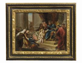 Il dipinto qui proposto, probabilmente un bozzetto preparatorio, descrive l'episodio, raccontato anche da Flavio Giuseppe nelle "Antichità Giudaiche", in cui il faraone Ramses I pone per gioco la sua corona sulla testa del piccolo Mosé che la scaraventa subito dopo a terra calpestandola.