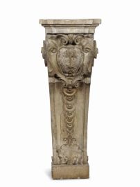 in stucco, piano di forma sagomata su base ornata al centro superiore da cartiglio contenente stemma tra grandi volute laterali, fusto curvilineo inciso a motivo di squame ricorrenti che si portano verso la base a ricciolo ornata al centro da conchiglia, su sostegno rettangolare, cm 110x40x37,7