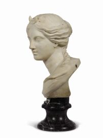Questo algido, purissimo Busto di Diana è un pezzo di scultura all’antica che sembrerebbe appartenere già a pieno titolo alla stagione neoclassica. Il suo riferimento a Giuseppe Piamonti-ni, scultore fiorentino autore di numerosi busti all’antica, si deve a Riccardo Spinelli, autore nel 2014 di una scheda che ne argomenta in modo articolato l’attribuzione. Se i più antichi (come quelli muliebri collocati lungo la scalone di Palazzo Pitti, riferibili alla fine degli anni Ottanta del Seicento, cfr. Sandro Bellesi, I marmi di Giuseppe Piamontini, Firenze 2008, pp. 20-21) sono ancora fortemente debitori del linguaggio tardobarocco di Giovan Battista Foggini, nella cui bottega Giuseppe dovette avviare i primi passi, tanto per le espressioni del volto quanto per il trattamento di panneggi e capigliature, già in una terracotta di poco successiva (Busto femminile all’antica, Firenze, presso Galleria Bacarelli, cfr. Bellesi, op. cit., p. 30) ogni eccesso è frenato dal continuo confronto con i modelli greco-romani. Utile è poi soprattutto l’accostamento con la Diana sempre nello scalone di Palazzo Pitti, probabilmente degli anni Novanta del Seicento, in cui la semplificazione formale è, per quell’altezza cronologica, già straordinariamente avanzata.