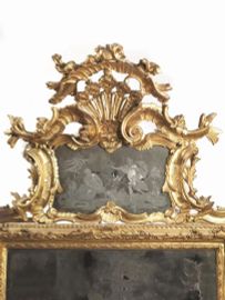 in legno intagliato e dorato, battuta a gola liscia con controbattuta a doppio nastro intrecciato a creare motivi ovoidali, fascia a fondo bulinato ornata ai centri e agli angoli da foglie aperte da cui si dipartono volute rocaille che discende su bordo a baccellature oblique; su questo si applica la grande cimasa a volute traforate culminanti in una grande palmetta sormontata da fiori e volute fogliacee che inquadra uno specchio molato con raffigurazione di Bacco e Arianna; fregi vegetali ricadono simmetricamente sui lati per riunirsi al centro inferiore a inquadrare una foglia aperta, cm 225x165