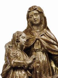 in legno dipinto e dorato raffigurante Madonna con Bambino in atto di benedire una devota, su base rettangolare ad angoli scantonati con bordo inciso a unghiature e ornato a decori fogliacei, cm 73x39x26