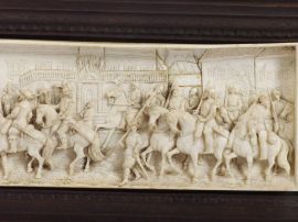 in avorio scolpito e intagliato raffigurante gruppo di soldati a cavallo in marcia, cm 5,5x19,8, entro doppia cornice in legno modanata, cm 16x29,5