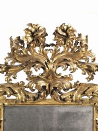 in legno intagliato e dorato, cornice di forma rettangolare alla quale si applica il decoro a giorno in foggia di ricchi tralci fogliacei che si dipartono da due volute contrapposte legate nel centro inferiore da un nastro pieghettato per risalire simmetricamente verso l'alto alternandosi nei centri a grandi girasoli a creare alla sommità due volute contrapposte poste a sostenere la cimasa preziosamente intagliata a tralci fogliacei culminanti in grandi fiori, cm 180x120