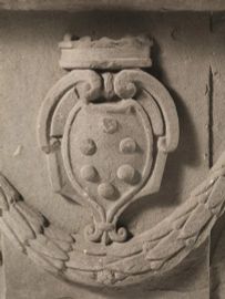 sostegni in pietra serena ad asso di coppe su zampe feline scolpiti con stemma della famiglia Medici e festone, piano in marmo giallo di Siena con becco di civetta, cm 78x176x88