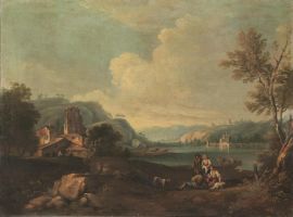 PAESAGGIO FLUVIALE CON PERSONAGGI E BORGO SULLO SFONDO