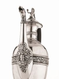 caffettiera con base circolare decorata da volute e boccioli che si ripetono nella fascia del corpo, beccuccio con finale zoomorfo, presa del coperchio realizzata come un putto inginocchiato, manico in legno ebanizzato; il presentoire ha una tesa sagomata profilata da motivi analoghi a quelli della base della caffettiera, il cavetto presenta una ghirlanda incisa, alt. caffettiera cm 40, diam presentoire cm 26, complessivi g 1915.