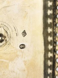 basi rettangolari con bordo traforato; piedini con la parte superiore realizzata a teste ferine e terminanti a zampa ferina, porta ampolle circolari su tre lesene con capitelli a foglie e cigni affrontati, fusti a lira con presa ad anello, alt. cm 30,5, complessivi g 1115 (2)