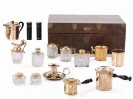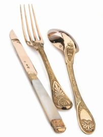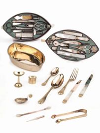 in vermeil, cristallo, madreperla e metallo, composto di forchetta, cucchiaio, cucchiaino da tè e due coltelli, tazza in porcellana decorata in oro; bicchierino, otto flaconi,una lattiera; una bacinella, una pinza da zucchero, un fornellino, una bugia, un porta uovo, due piccole teiere ed un cucchiaino; ventisei accessori in madreperla e metallo argentato ed una specchiera di epoca posteriore, entro scatola in radica. Peso degli oggetti in vermeil g 1120