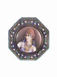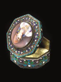di forma ottagonale interamente smaltata e decorata sul coperchio da figura femminile in abiti russi, g 110
