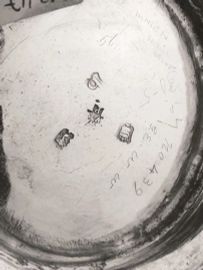 piede circolare, corpo lievemente sagomato e decorato, probabilmente in epoca posteriore, da volute e cesti di fiori e foglie, coperchio a cupola, presa a doppia voluta, interno vermeil, alt. cm 20,5, g 930