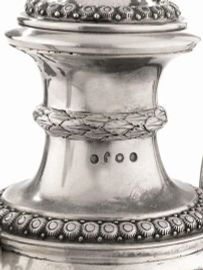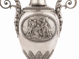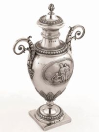 base quadrata su cui poggia un sostegno circolare decorato da fiori stilizzati in rilievo, corpo piriforme con foglie d'acanto nella parte inferiore e riserve circolari con scene dall'antichità sul fronte e sul retro; due anse a volute vegetali e coperchio con finale a bocciolo, alt. cm 38,5; presentoire, privo di bolli, di forma quadrata con base appesantita e decorato sui quattro fianchi da cetre e ghirlande, alt. complessiva cm 52, basi appesantite, complessivi g 2645 lordi