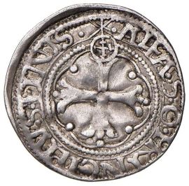 Ag gr. 1,03 D/ + SENA VETVS CIVITAS VIRGI S fogliata in cornice di nove centine con globetti R/ cerchio ricrociato radiato ALFA • 7 • O • PRINCIPIV • 7 • FINIS Croce fogliata in cornice di otto centine con globetti. MIR 533/2.