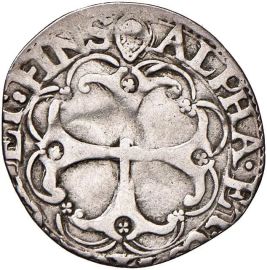 Ag gr. 1,38 D/ balzana SENA x VETVS x CIVITAS x VIRGN grande S fogliata in cornice di otto centine con fiorellini R/ balzana ALPHA • 7 • W • PRINCIPIV • ET • FINS Croce ancorata come al D/. MIR 532/8.