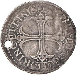 La foratura ci attesta un utilizzo di questa moneta a fini devozionali, come l’esemplare rappresentato nel CNI a tav. XXV, 13. Tipologia difficilmente reperibile in stato di conservazione migliore di questo vista anche la rarità del pezzo.