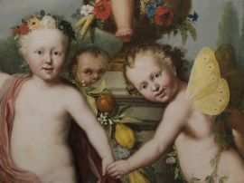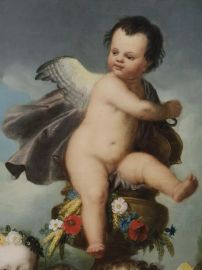 I dati biografici dei figli di Ferdinando e Carolina suggeriscono quindi un plausibile termine di datazione poco dopo il 1780 almeno per l’ideazione del nostro dipinto, pressoché coevo, dunque, alla più esplicita composizione di Pompeo Batoni – Allegoria per la morte di due figli di Ferdinando IV – dipinta a Roma nel 1780 e ora alla Reggia di Caserta. Rispetto a quel dipinto carico di emozione – identificato da Nicola Spinosa ed esposto in occasione della storica rassegna “Civiltà del Settecento a Napoli” organizzata da Raffaello Causa nel 1977, la tela qui offerta propone una versione più lieve degli eventi famigliari dei Borbone di Napoli, celebrandone la continuità dinastica nella persona del nuovo erede al trono. Una datazione a ridosso degli eventi, peraltro più logica di quella fin qui proposta alla fine del Settecento, sembra preferibile anche sotto il profilo dei dati stilistici.