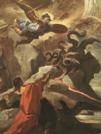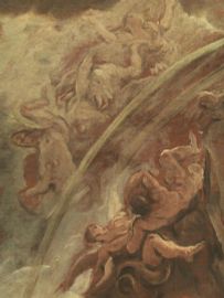 Reso noto per la prima volta da Nicola Spinosa in occasione delle mostre di Napoli e Bucarest, il dipinto qui offerto è stato analizzato in relazione a un bozzetto su tela di forma rettangolare di cui il nostro dipinto ripete la composizione nei suoi elementi essenziali e praticamente senza alcuna variante, se non appunto quelle dovute al diverso formato (Luca Giordano 1634 – 1705. Catalogo della mostra, Napoli 2001, pp. 354-55, 126b). Entrambe le tele raffigurano quindi la visione apocalittica ricevuta a Patmos da Giovanni, e in particolare il passo che si riferisce alla donna vestita di sole con la luna sotto i suoi piedi e coronata di stelle – immagine della Chiesa sposa del Signore ma in genere erroneamente associata alla Vergine Maria – il cui Figlio appena partorito è minacciato dalla Bestia, il dragone simbolo delle forze del Male. È essenzialmente la figura di Giovanni, e il paesaggio roccioso che fa da sfondo alla sua visione profetica, a distinguere il soggetto del nostro dipinto da quello, certamente più usuale e infatti più volte raffigurato da Luca Giordano, della vittoria dell’arcangelo Michele sul demonio, talvolta associata alla caduta degli angeli ribelli. Anche per questo motivo, il nostro dipinto e l’altra tela citata, anch’essa in collezione privata, sono stati collegati da Roberto Middione a un passo di Bernardo De Dominici, che nella sua “vita” del pittore napoletano ricorda una “Caduta di Lucifero co’ suoi seguaci” dipinta da Luca Giordano per un apparato delle Quarant’Ore nella chiesa di Santa Brigida a Napoli. Dovremmo ritenere, in questo caso, che il dipinto verticale costituisca un bozzetto d’insieme per quest’opera – non documentata altrimenti – e che il nostro possa esserne invece un “ricordo” ad uso di un collezionista o eventualmente dello stesso committente, come sembra suggerire l’elegante e curatissima cornice a trompe l’oeil che iscrive la composizione in un campo quadrato, quasi la visione apocalittica si spalancasse al di là di un’apertura circolare in pietra scolpita.
