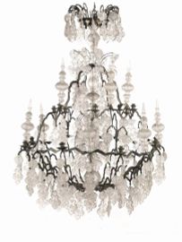 a due ordini di otto luci ciascuno, bracci di linea mossa in ferro battuto ornati da pendenti di forma sagomata con decori incisi sormontati da fiori, luci alternate a pinnacoli, grande corpo centrale in cristallo di rocca a balaustro con finali a corona di pendenti, alt. cm 150, diam cm 110